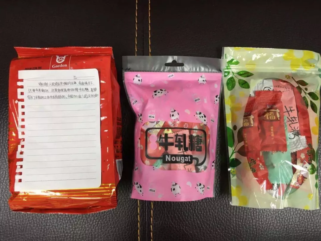 2月4日4时许,夜深人静,深圳市公安局福田分局香蜜湖派出所收到了一份特殊的礼物:三袋还带着余温的暖心食品,还附着一张小纸条:“谢谢人民背后坚强的后盾,在疫情当下,还要辛苦值班,这是家里连夜做的牛轧糖,希望你们辛苦的工作中甜甜的。中国加油!武汉加油!”这名热心市民表示,上一次到派出所求助的时候就是深夜凌晨4点钟,知道派出所的同志深夜的时候仍在辛苦值班,所以刚刚在家里做好了牛扎糖就迫不及待地马上送来,希望派出所的同志趁热吃一点,暖暖身子。收到如此暖心的礼物,香蜜湖派出所对这位热心市民表示衷心感谢!
