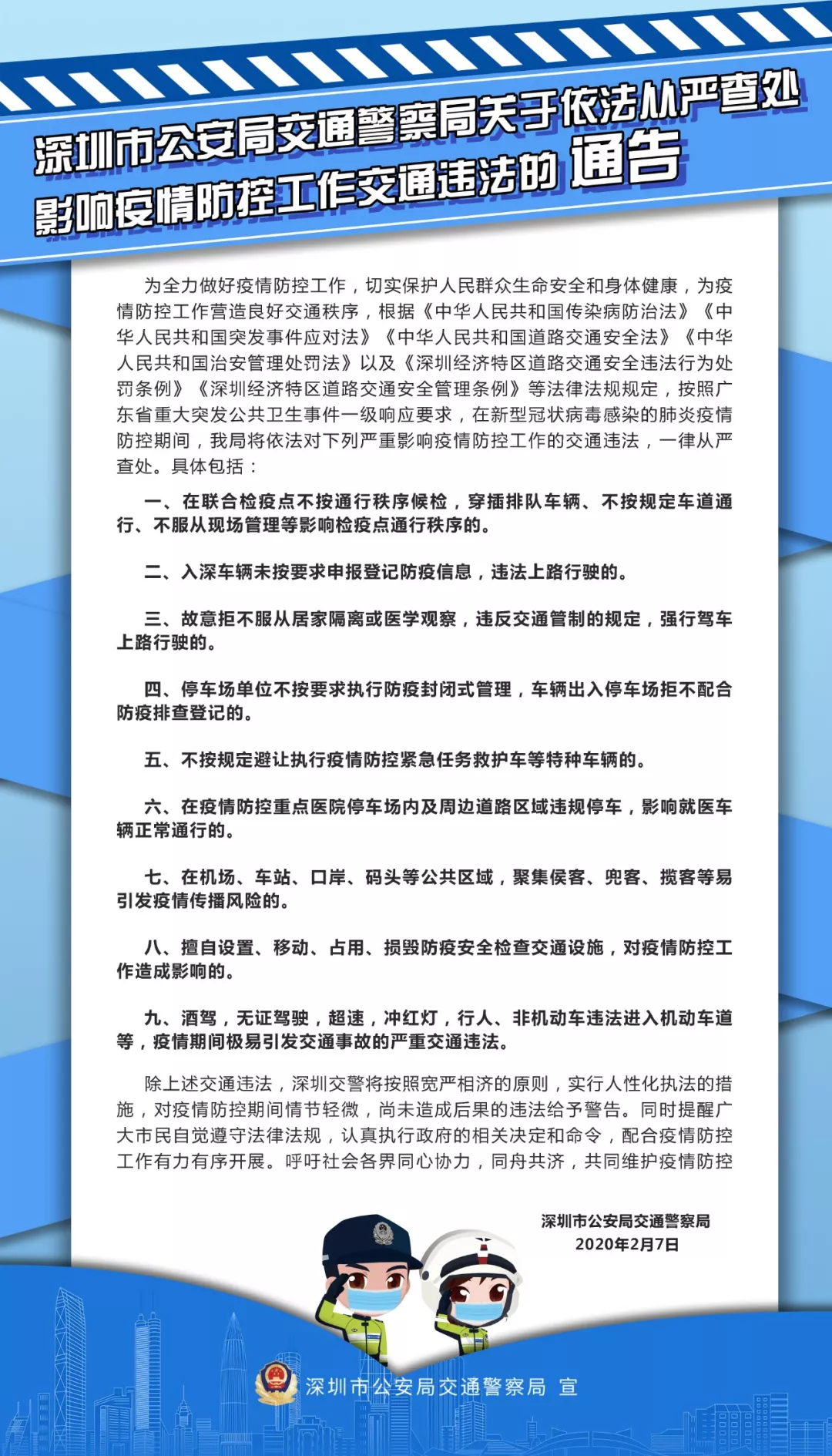 深圳市公安局交通警察局关于依法从严查处影响疫情防控工作交通违法的通告
