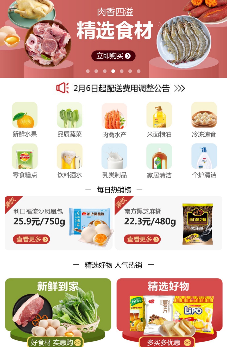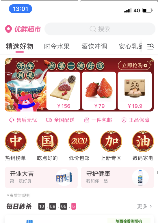 商品情况:除了生鲜日用品,母婴用品、厨具电器都有。但春节需求旺盛,需提前抢购,可先看看自己所在地区是否提供配送。
