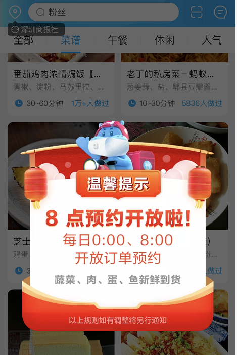 商品情况: app显示品类齐全,水果蔬菜、肉禽单品、海鲜水产、热食冻品等应有尽有。但库存有限,市民爆料反馈,自己多次在该app提前预约第二天菜品,多次显示预约已满,无法购买。