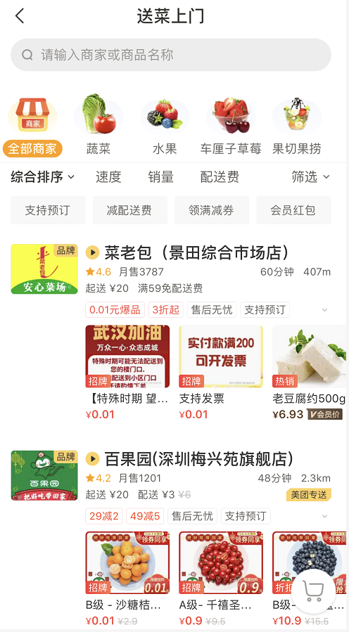 商品情况:未设买菜专区,不过店铺较多,商品丰富,市民可搜索菜品名字购买。但多家门店休息中,暂时关闭了线上派送,可先看看自己所在地区是否提供配送。
