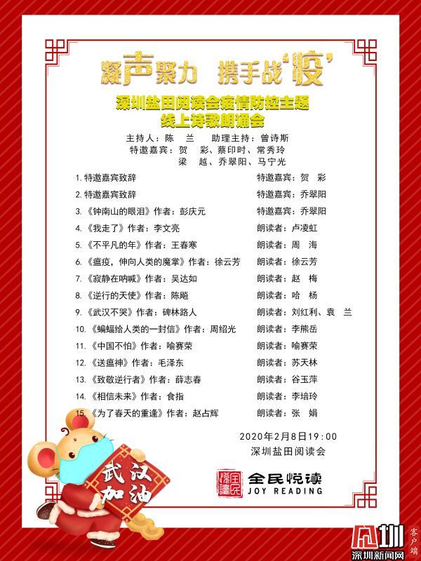 见圳客户端•深圳新闻网讯(记者 潘峰 通讯员 徐云芳)近日,全民悦读深圳盐田阅读会举行了一场“凝声聚力,携手战疫”抗击疫情线上主题朗诵会,为打赢防控疫情阻击战加油鼓劲。