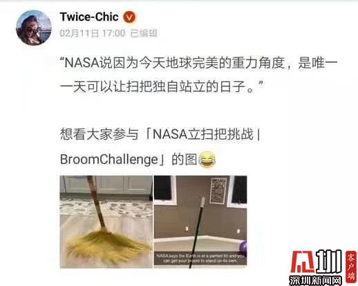 见圳客户端·深圳新闻网2020年2月11日讯 (见圳客户端、深圳新闻网记者 吴英敏)2月11日,有网友在微博晒出两张扫把直立的照片:“宅在家里试了一下NASA立扫把挑战,据说一年中只有今天可以立起来,亲测有效!”记者也在朋友圈发现许多朋友纷纷晒出扫把直立成功的图片,有网友称,“宅家立扫把”将全国人民心相连了!随后,人民日报微博辟谣称,真相是,扫帚能立起来与今天的引力无关,每天都可以立,只要你能找到平衡!