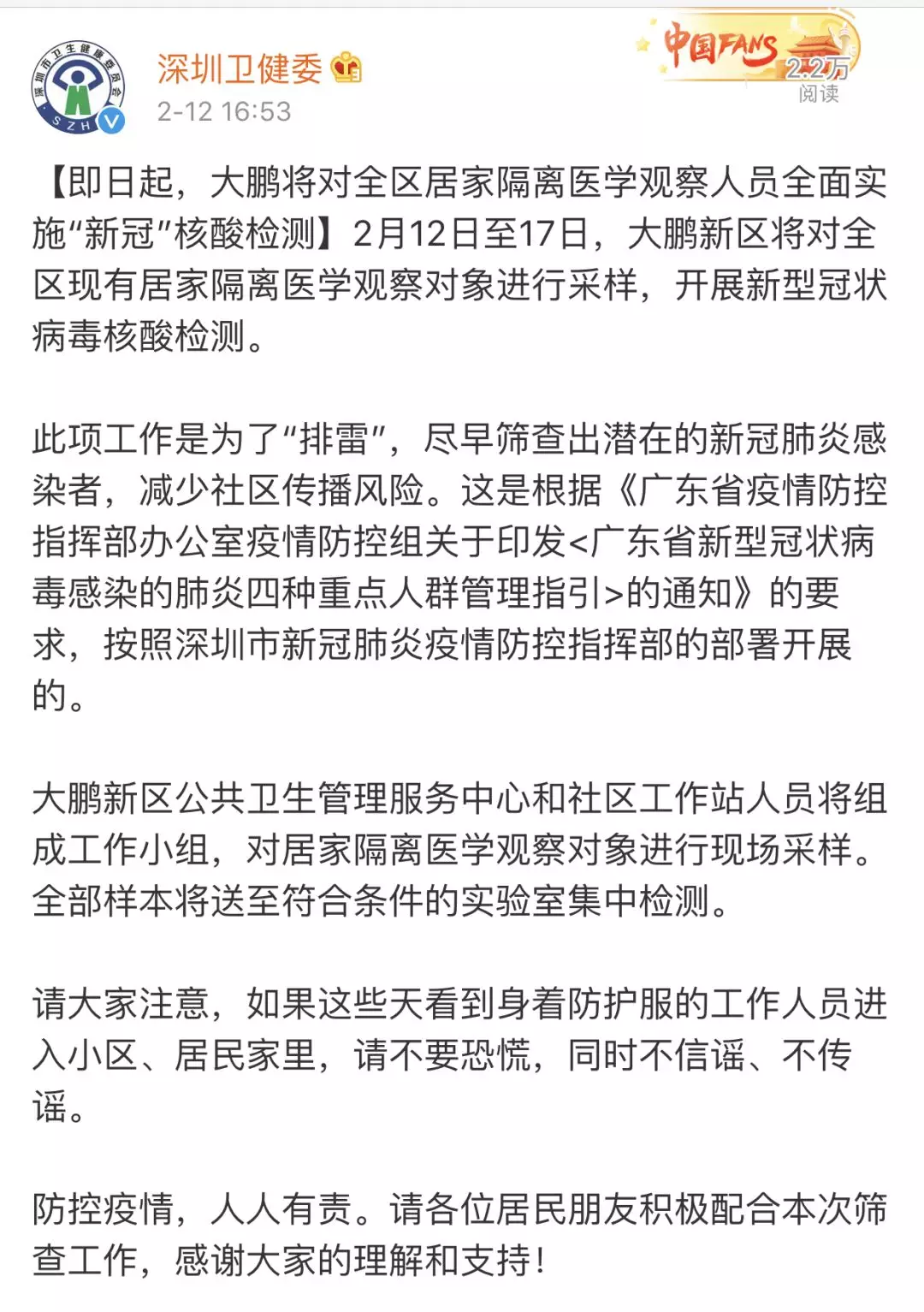 彻底“排雷”!深圳免费为所有居家隔离者检测“新冠”病毒核酸