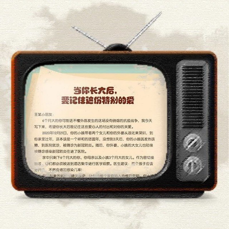 宝安区新安街道海富社区一名6个月大的孩子,因家里有人被确诊为新型冠状病毒感染的肺炎,被迫与家人分开进行医学观察。海富社区工作人员们对其悉心照顾,如今孩子已经平安度过了14天的居家观察期。海富社区特意为孩子留下一封情真意切的书信,希望孩子长大后,能记住这段特殊时期收获的特殊的爱。