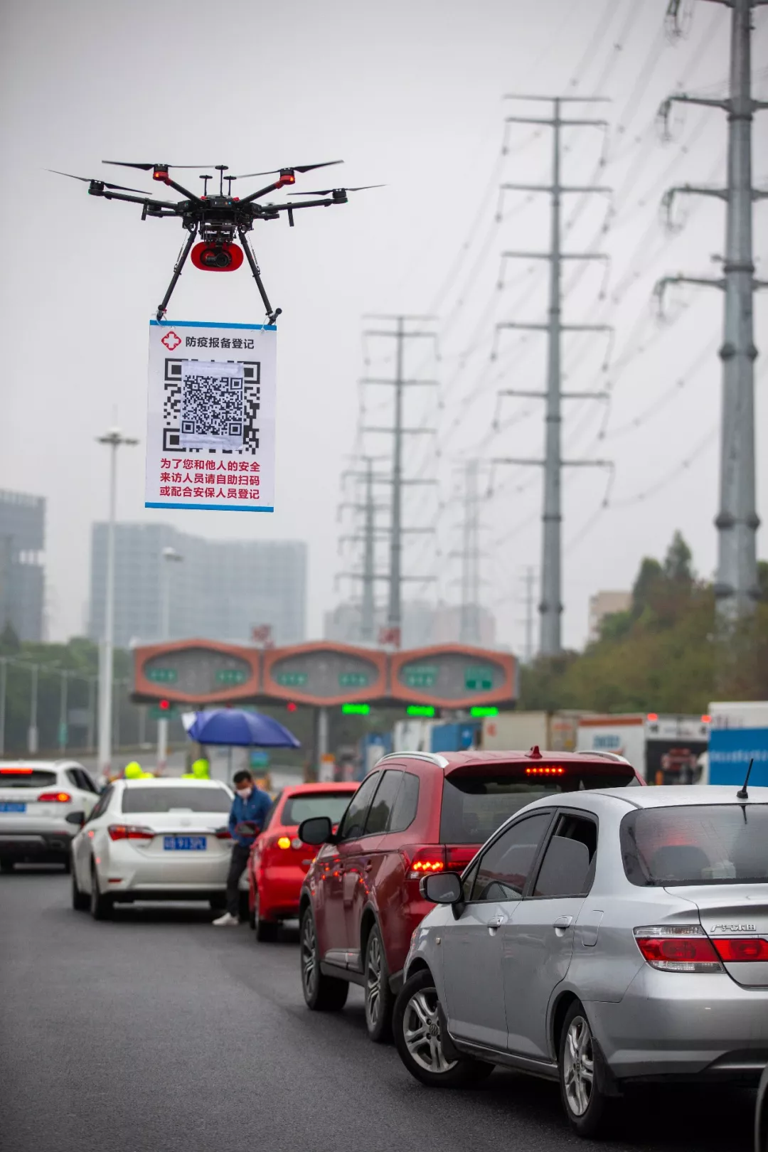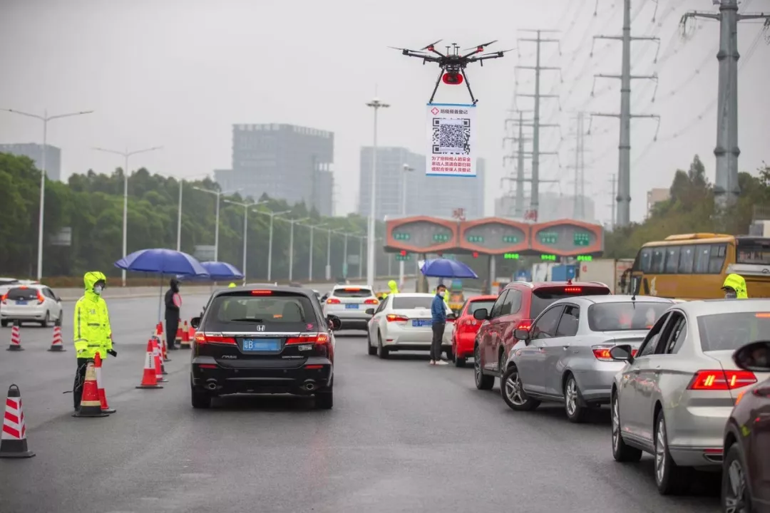 随着返深车辆和人员的增加,深圳从8日开始启用线上车辆申报登记。为提高申报效率,搭载喊话器、悬挂申报二维码的无人机成为防疫一线工作人员的得力助手。民警操作无人机在车辆队伍中穿梭,并通过喊话器提醒驾乘人员扫码登记,减少人员接触的同时提高了效率。