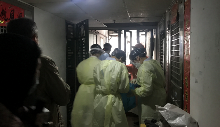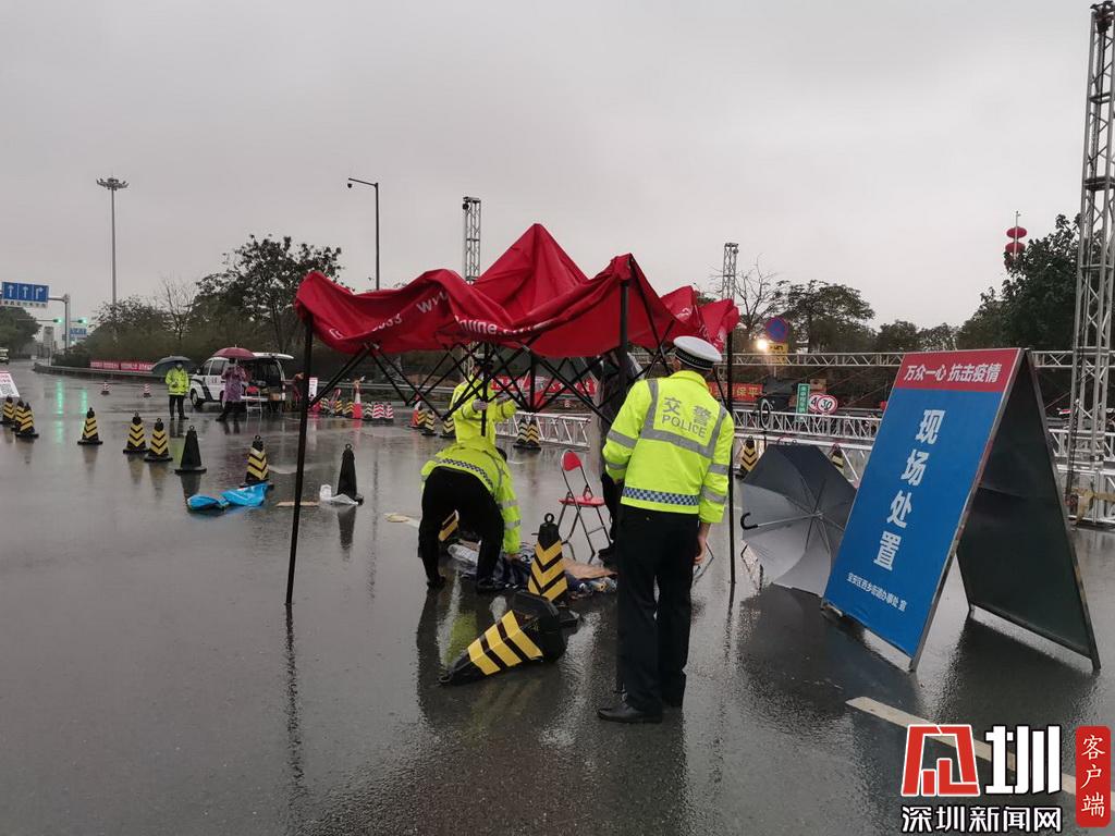 暴雨来临,深圳交警民警在检疫点安装雨棚。