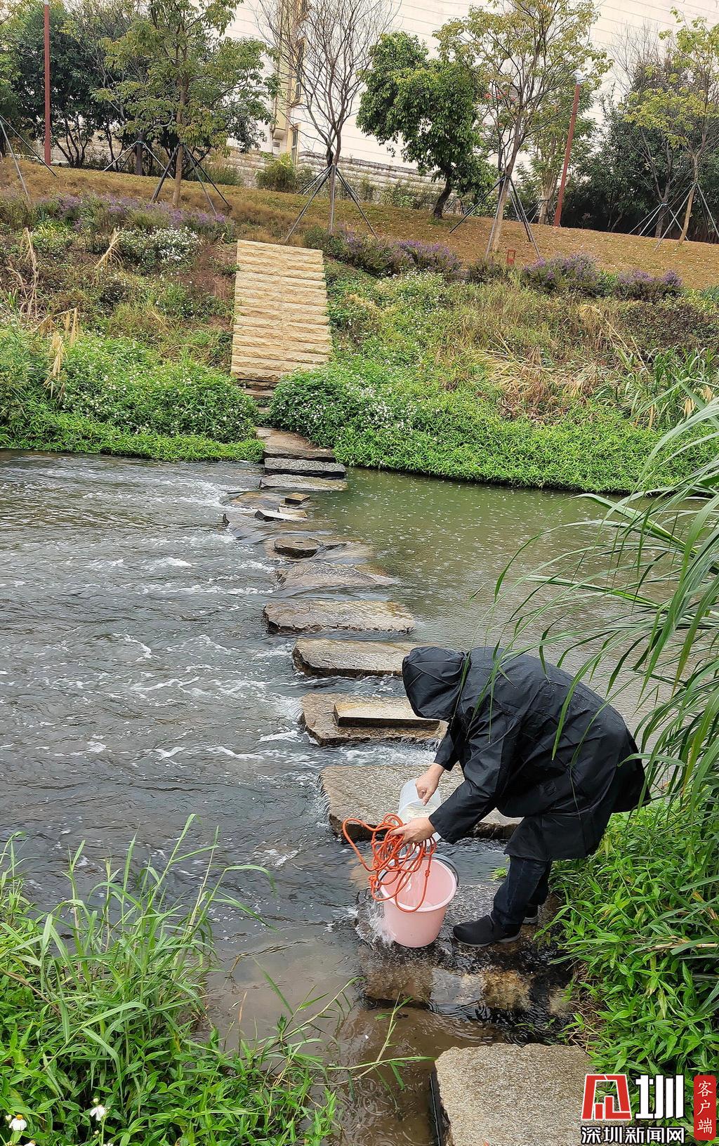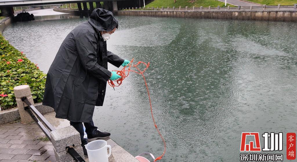 雨天,市环境监测中心站的监测人员在南山区大沙河取样,进行水质监测。