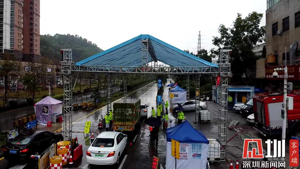 根据天气降雨预警,布吉街道经科办和后勤连夜奋战,在凤凰祥新西卡点搭建起长20米、宽10米、高5米的临时雨棚,保障一线奋战干部职工以及过往市民开窗检测的方便。