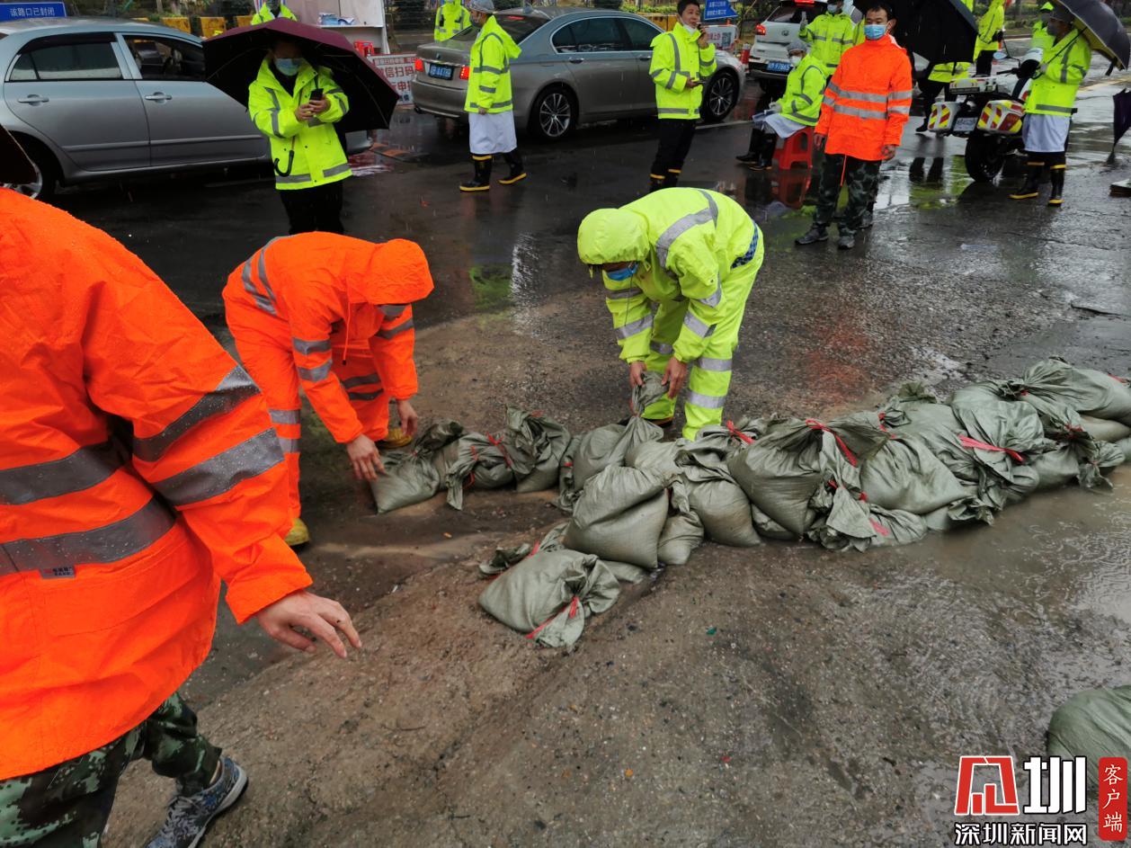 龙岗布吉街道一线工作者在路面筑沙袋墙,将雨水拦截。