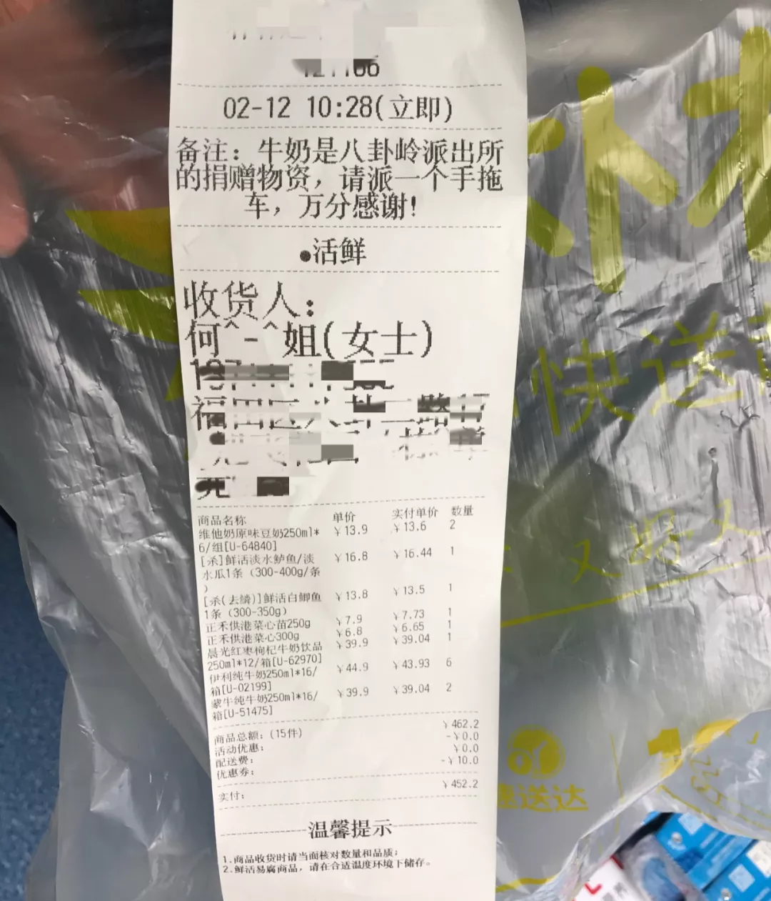 2月12日上午,一名群众来到深圳市公安局福田分局八卦岭派出所门口,送上防疫慰问物品。民警问及其姓名和联系方式时,她只说:“民警的辛苦我们都看在眼里,这是我作为一名市民的心意和谢意。”便转身离开了。民警在清点纪录物资时,无意中发现了该热心市民订购物资的一张采购单,八卦岭派出所全体警务人员在这里对不肯留名的何女士表示衷心的感谢!疫情无情、人民有情,温暖警心、坚定前行!