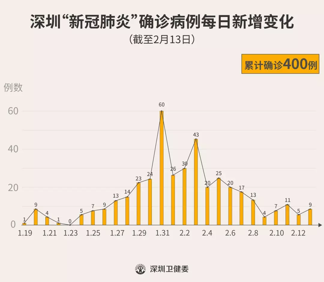 截至2月13日24时,深圳累计报告“新冠肺炎”确诊病例400例。2月13日当天全市新增确诊病例9例(个案详情今晚公布)。