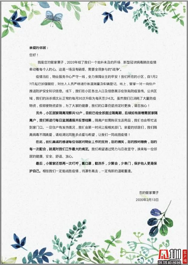见圳客户端·深圳新闻网2020年2月13日讯(见圳客户端·深圳新闻网记者 潘润华)“他们对疫情的恐惧并不少半分,可却坚持在工作岗位。”“他们就是我们心目中的逆行者。守护着我们的安全。”近日,一幕幕暖心画面在深圳上演,不少业主纷纷踊跃为物业员工捐款,以表达对这些“平安守护者”“逆行人”的谢意。