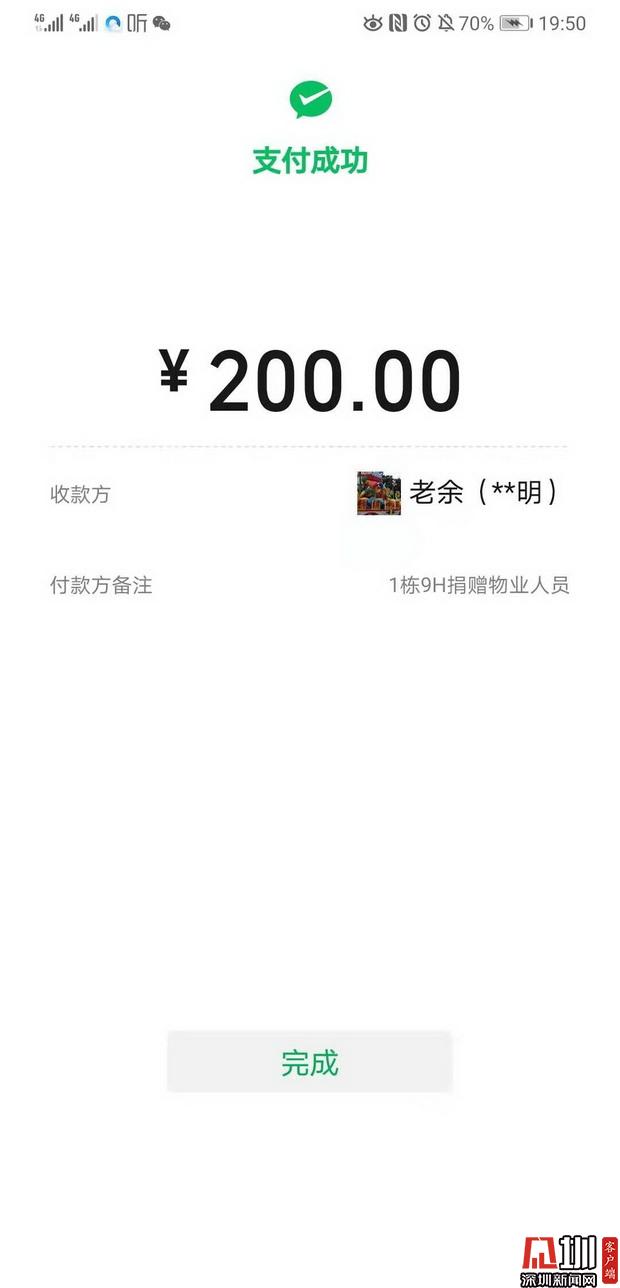 50元,200元,300元……2月13日晚,位于福田区的金海燕花园的业主们也加入了捐款“大军”。有业主还提议,将所有捐款以奖金形式,平均发放给物业工作人员,以此表达对物业工作人员辛勤工作的肯定和鼓励。“如果有余力的邻居,再捐一点急用物资也可以。”