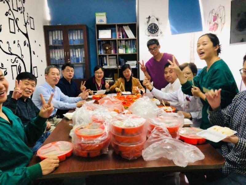 20:40,院领导和专家刚刚讨论会诊结束,病房同事也刚刚完成轮换交接。配餐室突然多了好多人,大家好像约好的似的,都不愿意回去自己过年。我们相聚一起,不分上下级,我们只是一群同事(其实,刘映霞副院长也在)一起吃除夕工作餐,一起过大年。