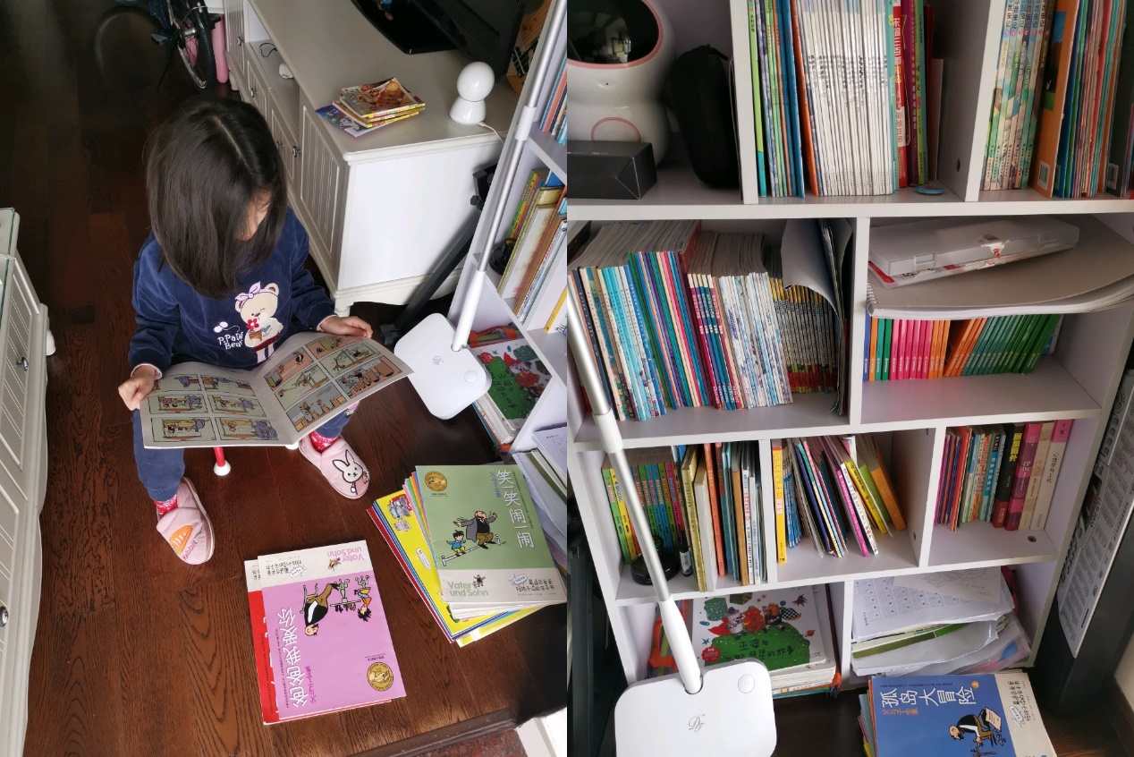(图二:看书,她有自己开放式的小书柜,有时候是我们陪读)