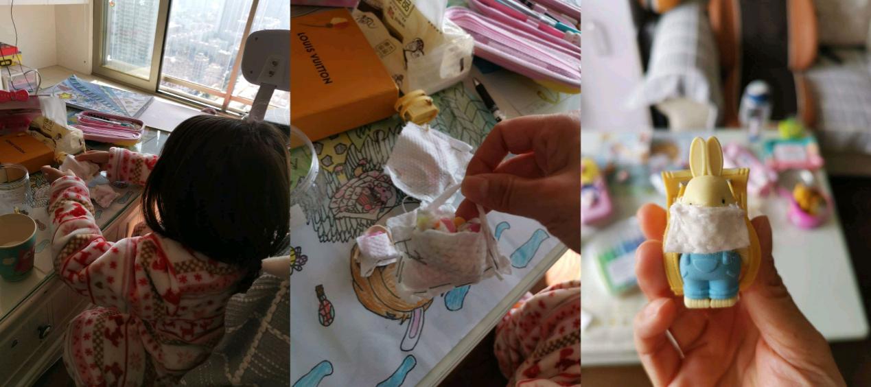 (图五:玩手工,给娃娃们缝制口罩或包包)