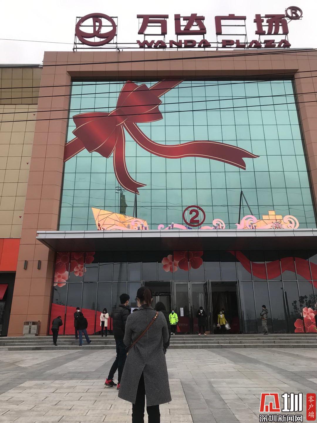 离开武穴城市广场,吕女士又来到开业才10多天的万达广场。碰上疫情,四层的商场里也只保留了超市在营业。万达广场超市门口有少许人排队,工作人员在引导排队市民保持一米以上距离。