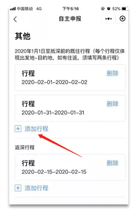 第二步:添加行程。如有多段行程,请在点击确定后,再次点击“添加行程”,添加下一段行程。