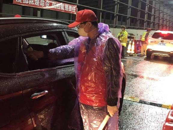 龙城街道党员干部、工作人员与龙岗区退役军人义工队、龙岗交警组成防控队伍,借助现场高速雨棚的遮挡,对进深车辆一一进行排查。