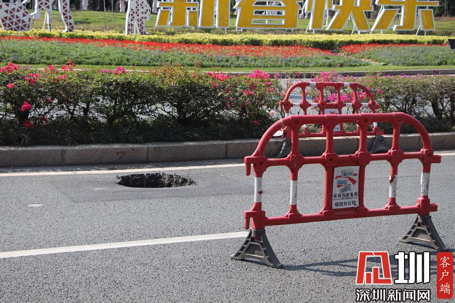 据市交通运输局福田管理局的蔡警官介绍,18日上午9点40分,他在福田区深南大道辅导市民广场路段例行巡逻时,发现路面有一塌陷的坑口,立即向上级汇报,并用铁马将洞口围起来。“大概十五分钟后,各个负责部门的工作人员就陆续到场了,期间也没有造成什么交通意外。”