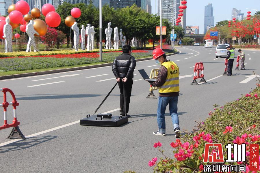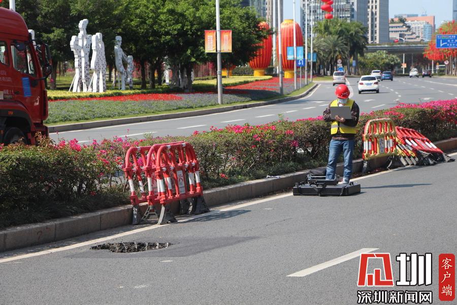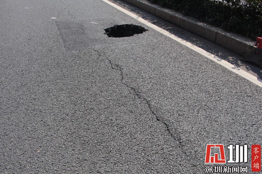 上午10点40分,记者在现场看到,该路面有一个直径约一米、深约一米的坑口,旁边还有一道长约20米的裂痕。工作人员正在使用雷达仪器对地面情况进行勘测,同时该路段及靠深南大道一条车道已暂时被封锁,福田区交警大队也在现场指挥交通。据悉,该位置较临近的地铁2、3路线的站点,一位深圳地铁的工作人员告诉记者,目前该事故没有对其线路运行造成影响,也非先前修挖地铁所致。