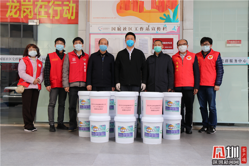 深圳市人大代表、广东吉明玻璃工程有限公司总经理吴冰向国展社区工作站热心捐赠消毒液等物资。