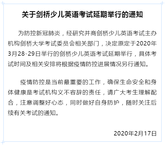 为贯彻落实国家和我省对新型冠状病毒感染的肺炎疫情防控有关工作的部署和要求,切实保障广大考生和考试工作人员生命安全和身体健康,经研究决定,推迟原定于3月7-8日举行的普通高考英语听说考试和本科插班生考试(含三二分段专升本转段考试)。具体时间安排视疫情控制情况另行通知。