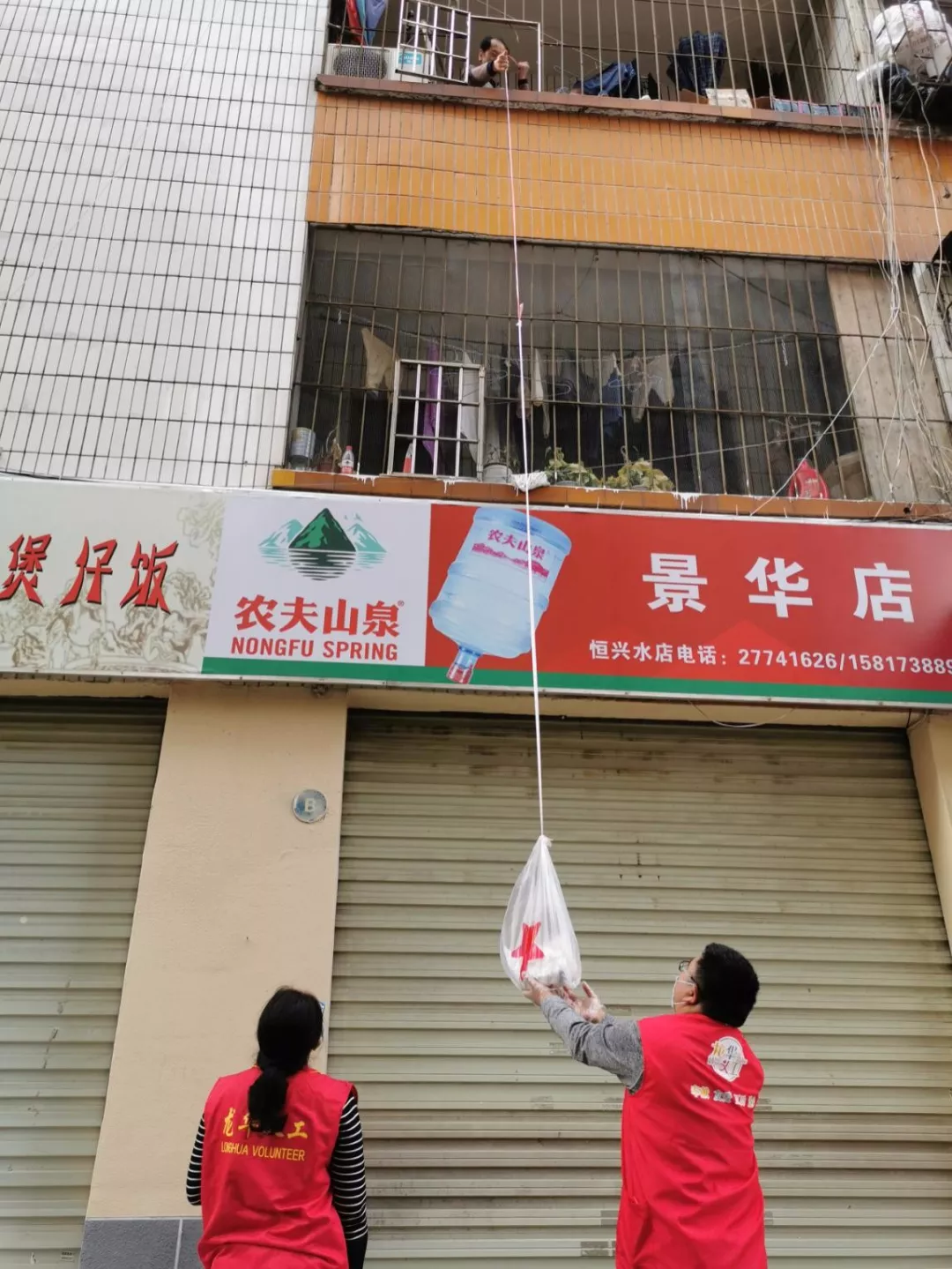 “为了实现无接触配送,每天阿姨会把绳索放下来,她会电话告诉我们需要的菜品和生活用品,我们把她需要的东西都‘送’上去”。赵发威日常除了服务社区弱势群体购买生活必需品,还承担机动岗为需要替岗的志愿者“爱心接力”、执行社区抗疫检测点的测温登记工作。