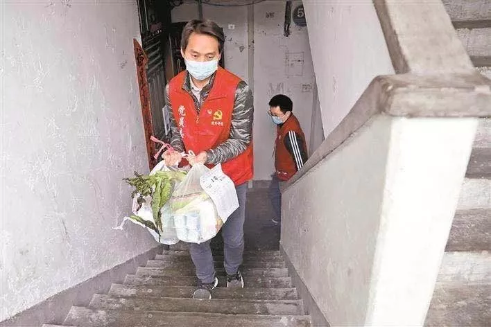 新秀社区党员志愿者为居家医学观察的家庭配送食品物资(深圳晚报记者杨少昆摄)