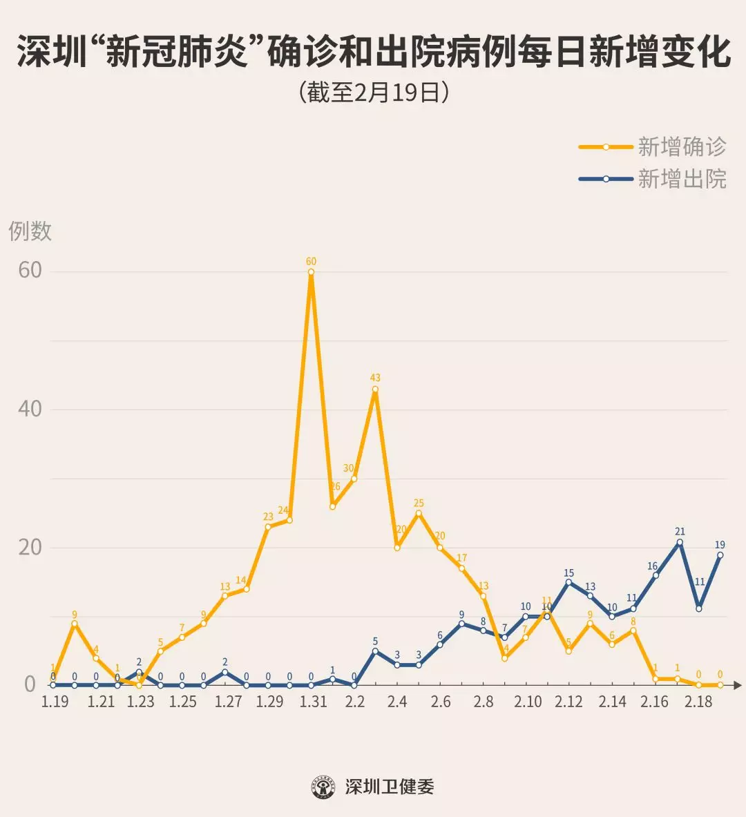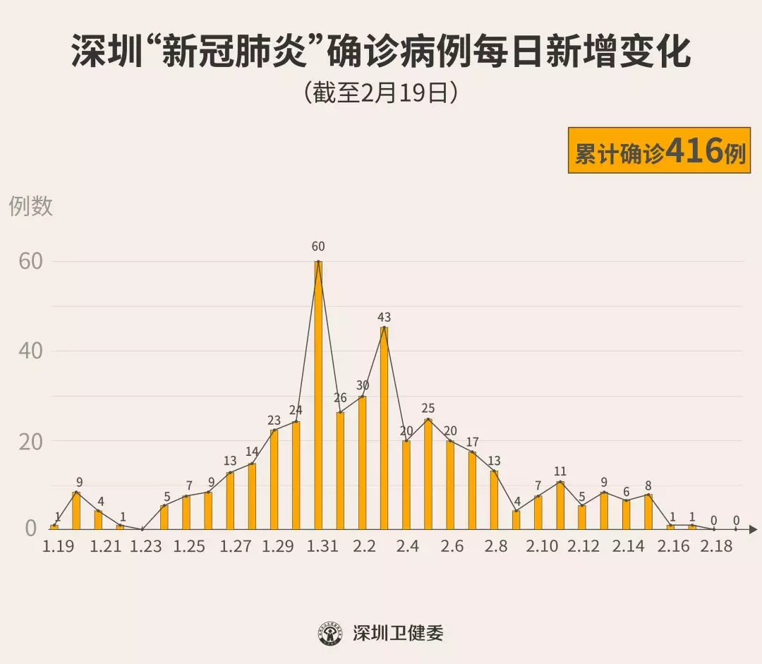 截至2月19日24时,深圳累计报告“新冠肺炎”确诊病例416例。2月19日当天全市无新增确诊病例。 ▲新增出院病例已超过新增确诊病例 累计报告确诊病例中,男性197例、女性219例。 按照病例管理地区划分,南山区87例、福田区80例、龙岗区71例、宝安区62例、龙华区34例、罗湖区32例、光明区11例、坪山区7例、盐田区6例、大鹏新区2例、其他(指由机场、车站、码头、关口、路卡等直接送往定点医院的)24例。 目前,重症10例、危重症10例,死亡2例,累计出院182例。 232例确诊病例均在深圳市第三人民医院隔离治疗。 287例密切接触者正在接受医学观察。 资料来源:深圳市疾控中心、深圳市卫健委、广东省卫健委