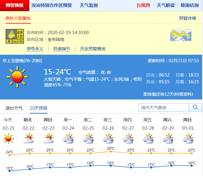 见圳客户端·深圳新闻网2020年2月21日讯 深圳市气象局预计21-23日晴天间多云,空气干燥,气温回升,早晚清凉,21日气温15-24℃;24-27日云量增多,天气温暖,湿度加大,偶有零星小雨,早晚能见度较低。