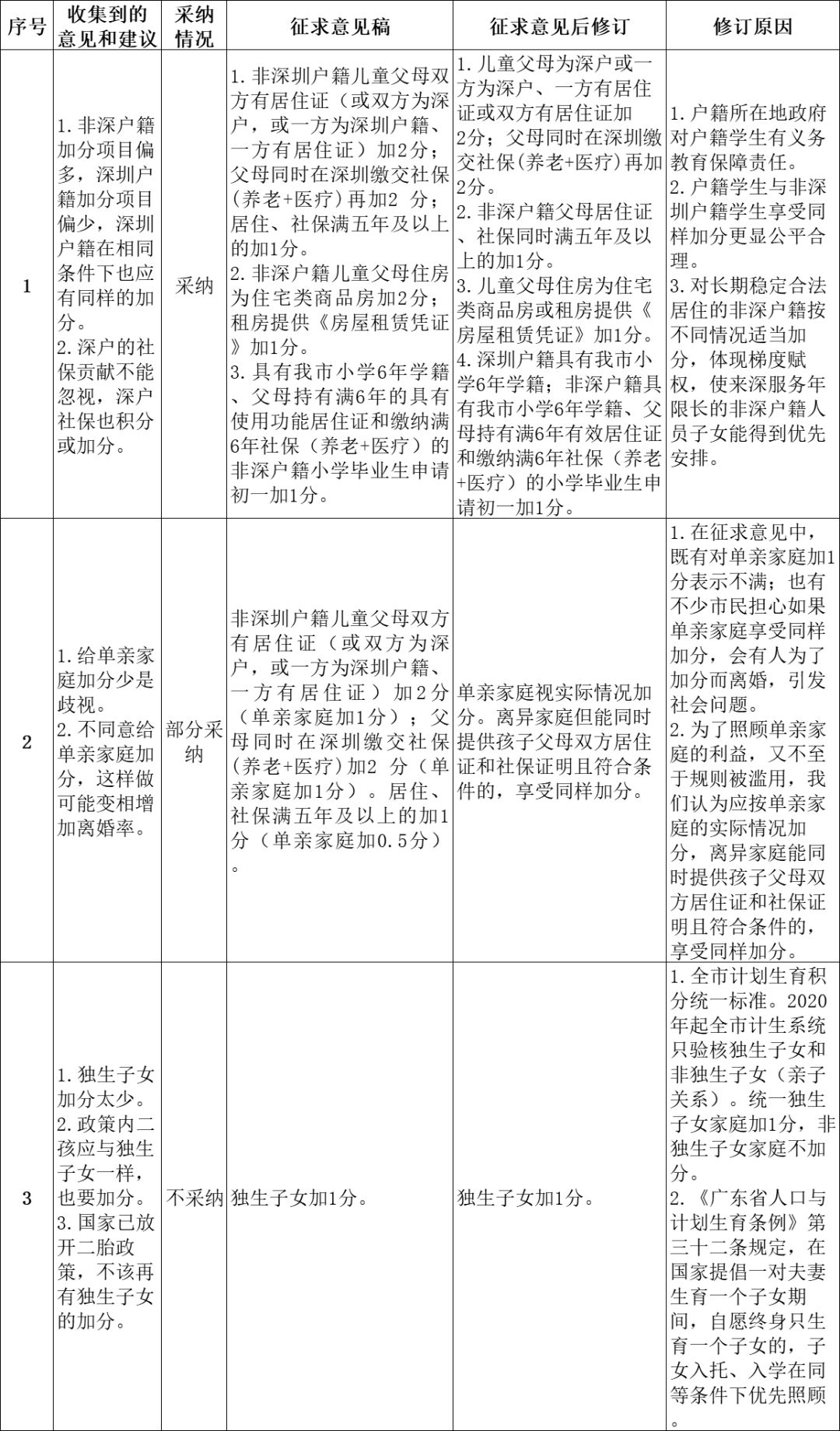 据了解,1月13日-24日,《罗湖区义务教育学位申请分类和积分办法(征求意见稿)》在“罗湖政府在线”和“罗湖教育应用网”公开征求公众意见期间,共计收集市民意见和建议共205条。其中邮件106封,信函2件,电话97个。经过梳理,区教育局将比较具有普遍性、代表性的意见和建议进行了研究分析,对合理化意见和建议予以采纳。