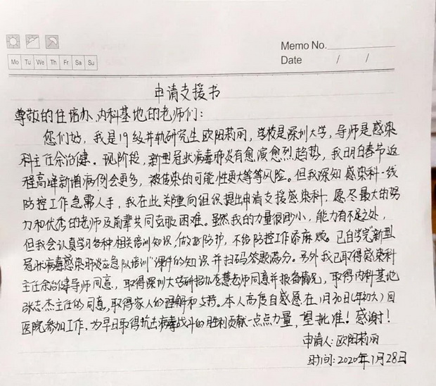 作为内科学传染病方向的研究生,疫情爆发后,尽管学校和住培办通知学生在家待命,但欧阳莉丽深知院里感染科一定很需要人手,于是经过层层申请,终获得支援批准。大年初五返深后,欧阳莉丽当晚便进行采样培训,初六便开始值班,至今依然奋战在这个岗位上。