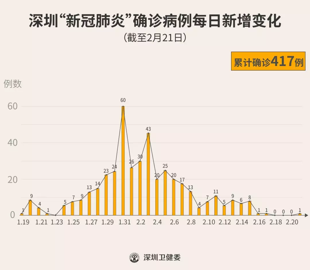 截至2月21日24时,深圳累计报告“新冠肺炎”确诊病例417例。2月21日当天全市新增确诊病例1例(个案详情今晚公布)。 ▲新增出院病例已超过新增确诊病例 累计报告确诊病例中,男性197例、女性220例。 按照病例管理地区划分,南山区87例、福田区81例、龙岗区71例、宝安区62例、龙华区34例、罗湖区32例、光明区11例、坪山区7例、盐田区6例、大鹏新区2例、其他(指由机场、车站、码头、关口、路卡等直接送往定点医院的)24例。 目前,重症10例、危重症9例,死亡2例,累计出院222例。 193例确诊病例均在深圳市第三人民医院隔离治疗。 202例密切接触者正在接受医学观察。 资料来源:深圳市疾控中心、深圳市卫健委、广东省卫健委