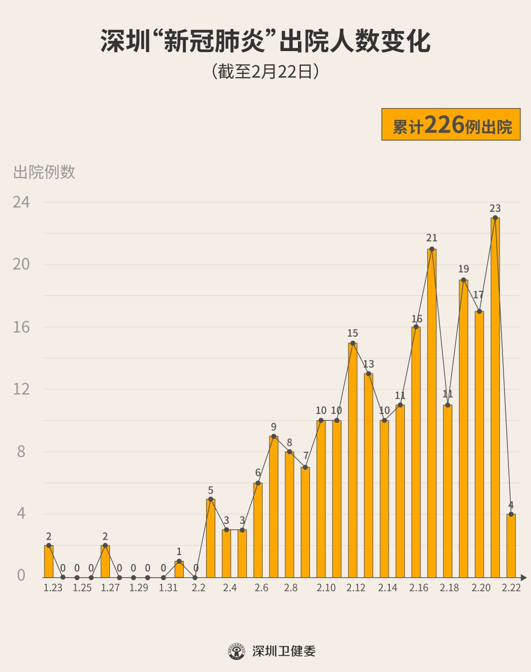 2月22日下午,经专家组会诊,深圳再有4名新型冠状病毒肺炎确诊患者出院,累计达226人,连续20天有人出院。