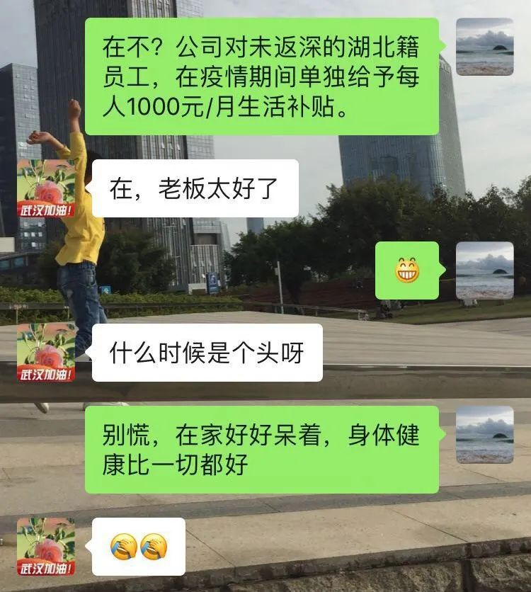 “工资已经全额到账,由于疫情影响,针对不能返程的湖北籍员工,每人额外发放1000元生活补贴。”2月17日,身在湖北公安的晏君收到公司通知后,悬着的心终于放了下来。晏君是深圳坤弘印务有限公司仓储部记账员,她坦言,公司发放的工资和生活补助是“雪中送炭”,过去近一个月心里确实很忐忑,既担心没工资发,又害怕丢了工作,如今不用担心经济来源了。“关键时候,公司不仅没有抛弃我们,还给我们诸多关爱。我发现我更爱公司、更爱我的工作了。”