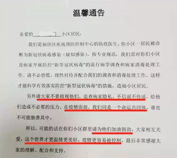 “疫情面前,我们同是一个命运共同体”“大家相互关爱,这个世界才更温情美好,疫情更容易被控制……”1月30日,位于深圳福田区的一小区出现新冠肺炎疑似感染病例,福田区疾病预防控制中心的防疫医生随即发布了这则通告,瞬间刷屏了深圳人的朋友圈。通告除了呼吁小区居民配合调查及消毒处理工作外,还特地恳请大家“不要歧视,在疫情面前,我们是同一个命运共同体,谁也不可能独善其身。”寥寥数字的“请求”,感动无数人。