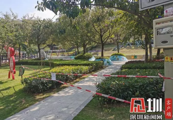 在光明区新城公园,记者看到公园里游乐设施区域已被封,暂未对外开放。道路两旁的小喇叭正播放着防疫宣传广播,提醒市民出门戴好口罩,勤洗手,注意防护。