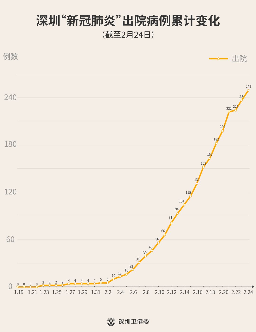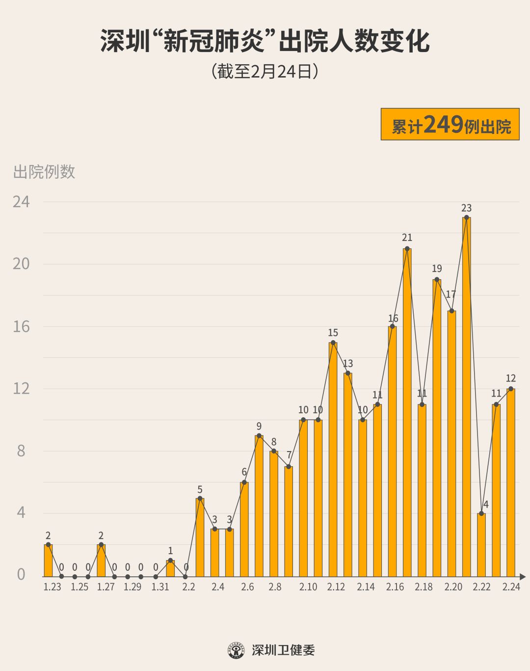 2月24日下午,经专家组会诊,深圳有12名新型冠状病毒肺炎确诊患者出院,累计达249人,连续22天有人出院。