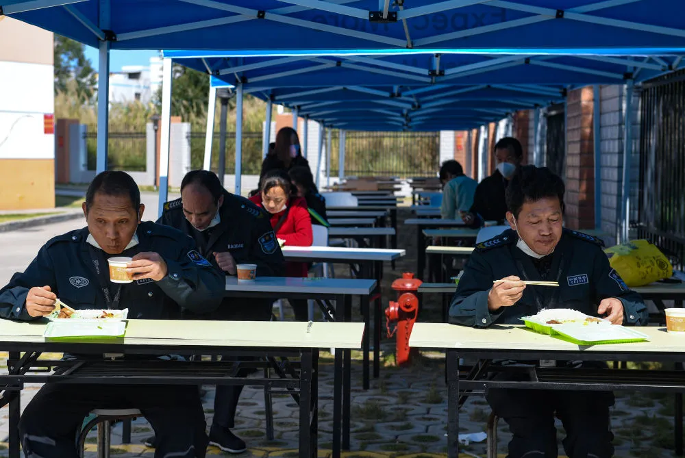 位于福城街道的泰衡诺科技有限公司园区,员工在临时“食堂”分桌就餐。