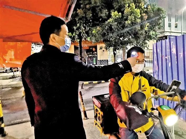 民治街道上芬社区网格员在卡点为进出人员进行体温检测。