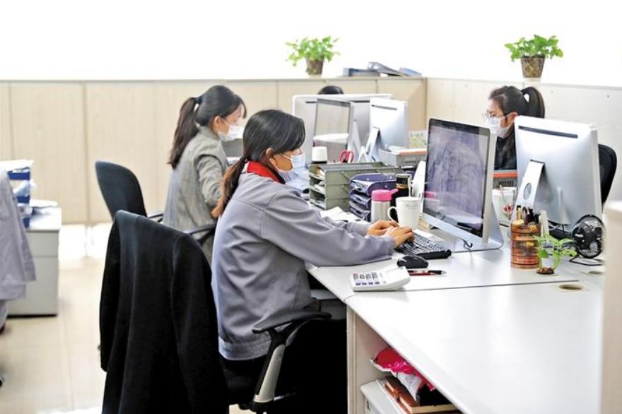 位于观澜街道的国桥实业(深圳)有限公司,员工带着口罩有序办公。