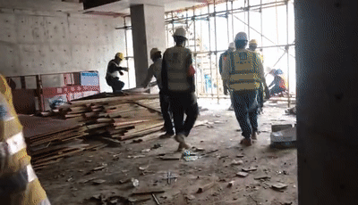 尚龙苑施工现场,工人们戴着口罩在进行模板拆除作业。