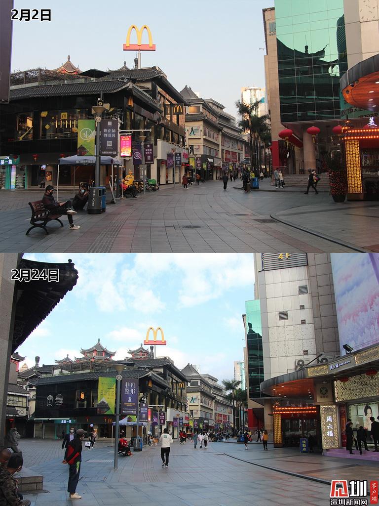 上图为2月2日,在东门步行街人烟稀少,下图为2月24日,东门步行街进入复工第一天,营业的店面开始增多。