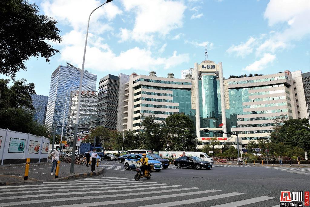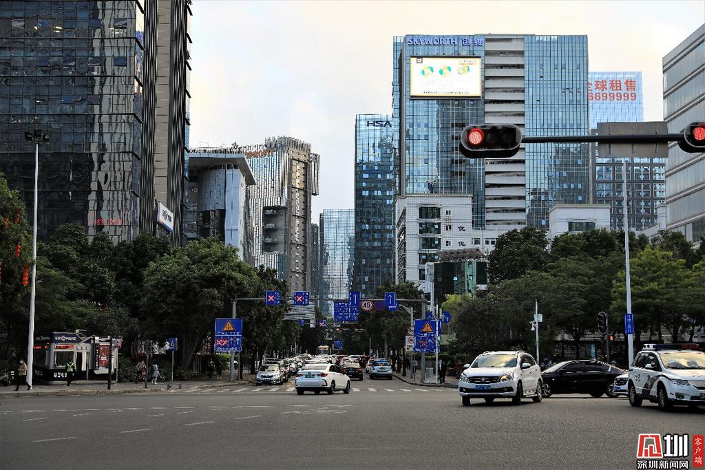深圳科技园大楼外,工作时间的科苑科发路口车流量依旧不小。
