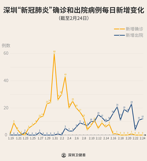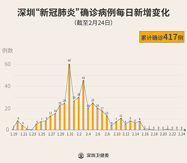截至2月24日24时,深圳累计报告“新冠肺炎”确诊病例417例。2月24日当天全市无新增确诊病例。