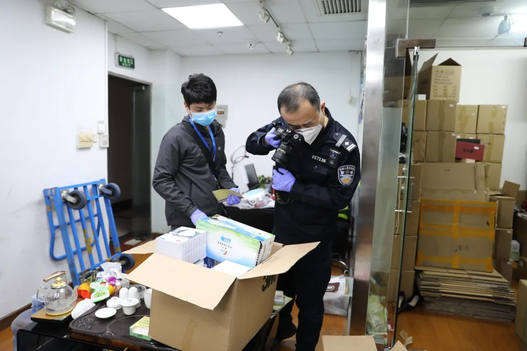 (刑警大队民警对查获的伪劣口罩拍照取证)