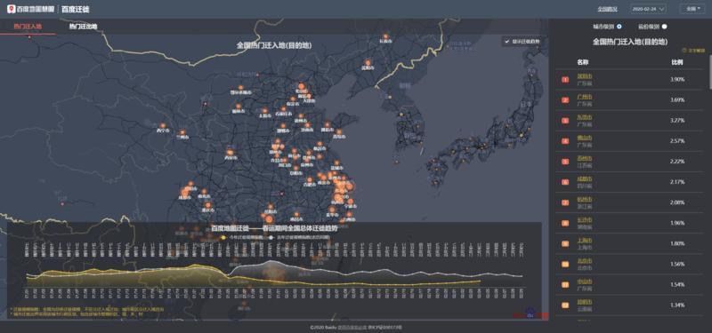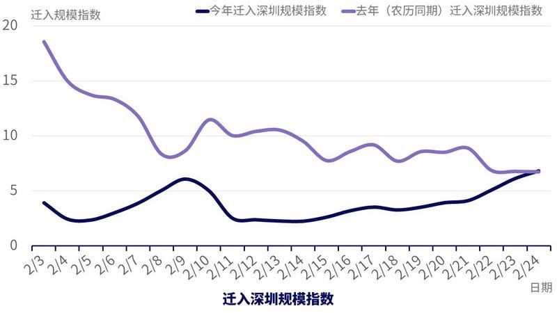 从百度迁徙地图看到,2月21日起,深圳已连续4天居全国热门迁入地榜首,同时,迁入规模指数也逐渐接近去年农历同期水平。