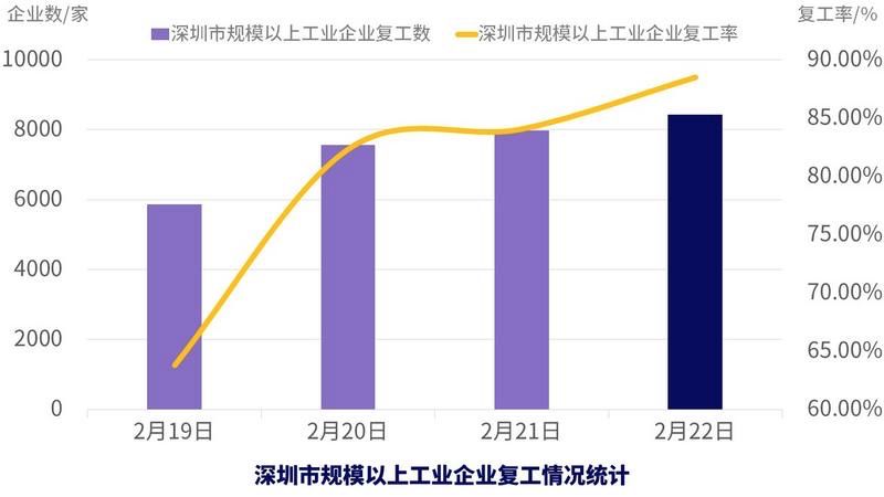 2月20日,深圳单日复工企业数超1万6千家,较前一天增长23%,规模以上企业复工数也增长了近30%。2月21日,全市累计复工企业超10万家,增速近20%,同时,全市规模以上企业复工率超80%。2月22日,复工企业单日再添1万多家,全市企业复工快速有序地进行中。